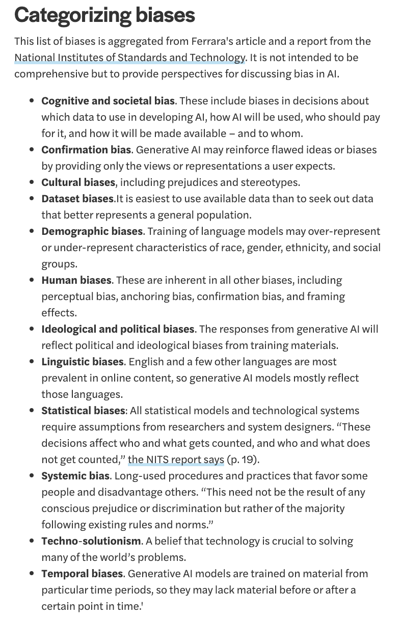 According to Susan D’Agostino "AI outputs are often not representative of the depth and breadth of many students’ multicultural and multilingual experiences" and when our students don't seem themselves or a reflection of the greater community in the output, problems arise. We can not let those biases prevail, so our lessons and discussions in the classroom can begin demanding more from AI. Kansas State University notes that"By better understanding the many facets of bias and considering how it influences our actions, though, we can improve our ability to lessen its effects."